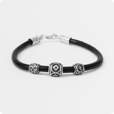 Тонкий черный кожаный браслет, украшенный бусинами-шармами из серебра, универсально подойдет мужчинам и женщинам. На серебряных бусинах изображены древнеславянские обереги Репейник счастья, Вайга и Огневица, которые помогут достичь гармонии с собой и мирозданием.